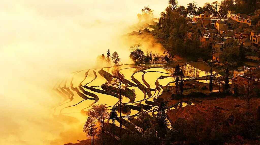 位于云南省元阳县的哀牢山南部,是哈尼族人世世代代留下的杰作。元阳哈尼族开垦的梯田随山势地形变化,因地制宜,坡缓地大则开垦大田,坡陡地小则开垦小田,甚至沟边坎下石隙也开田,因而梯田大者有数亩,小者仅有簸箕大,往往一坡就有成千上万亩。元阳梯田规模宏大,气势磅礴。