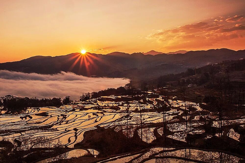 ●清晨04:30分前往日出醉佳地——【多依树梯田】观看拍摄日出,朝阳呈逆光角度驱散晨雾,层层梯田便渐渐染上金光,坐落其间的哈尼族彝族山寨,被云雾掩映得扑朔迷离,如诗如画,如梦如幻。