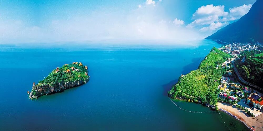 位于玉溪市澄江县以南5公里处,因湖水清澈见底、晶莹剔透,被古人称为“琉璃万顷”。是中国最大的深水型淡水湖泊,珠江源头第一大湖,属南盘江水系。抚仙湖名与一个神话故事有关:相传玉皇大帝派了天上的石、肖二仙到人间巡查,来到滇中,只见一池碧水,波光粼粼,两仙人被湖光山色所迷,忘了回返,变为两块并肩搭手的巨石,永远站立湖边。过去湖东南方有两石并肩搭手倚立,据说就是石、肖二仙,在湖上驾舟遥望,还能若隐若现地看到两仙人在观赏,为留其迹,故名抚仙湖。