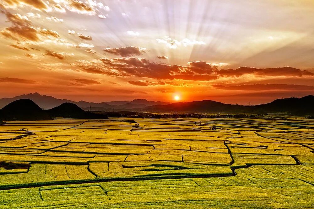●早餐后08:00分游览拍摄【金鸡峰丛】(游览约1小时),这里有着无边无际的金黄色海洋,气象万千,令人目不暇接。让你置身于话的世界花的海洋。此处拍摄地方比较灵活,大家可以分开拍摄,金鸡峰可以在山头上拍摄,山不高,天气好可以拍摄到耶稣光射到云雾中若隐若现的油菜花以及金鸡峰群中。罗平用中餐